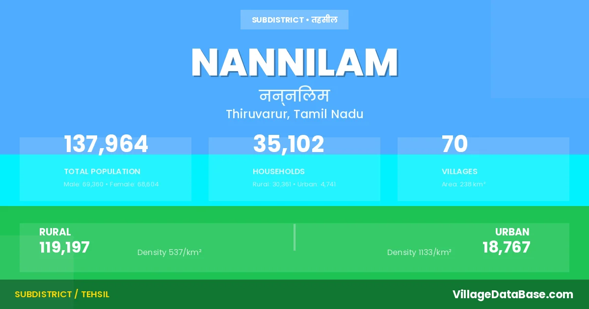 According to the 2011 census The total area of Nannilam Taluka is 238 km², with a population of 137964 people. The population density is 579 inhabitants per square kilometre, and there are approximately 35102 houses in the sub district.
