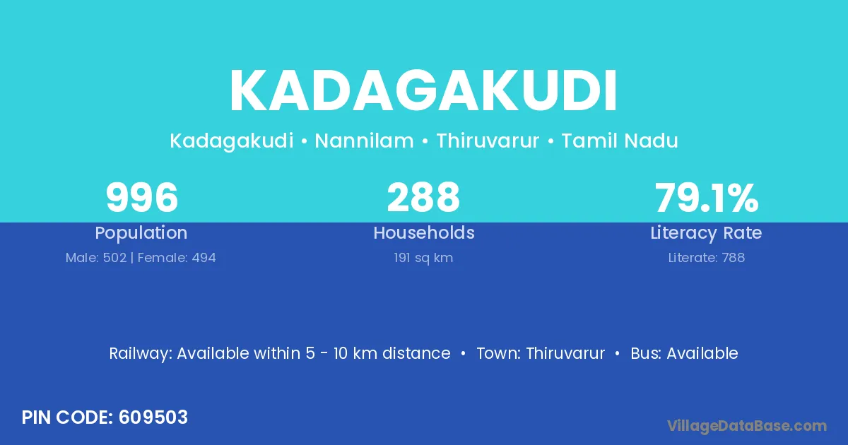 Kadagakudi village has a total population of 996 people, of which 502 are males and 494 are females.