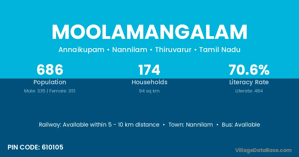 Moolamangalam village has a total population of 686 people, of which 335 are males and 351 are females.