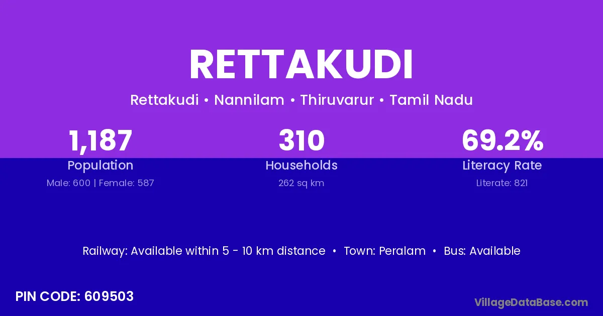 Rettakudi village has a total population of 1,187 people, of which 600 are males and 587 are females.