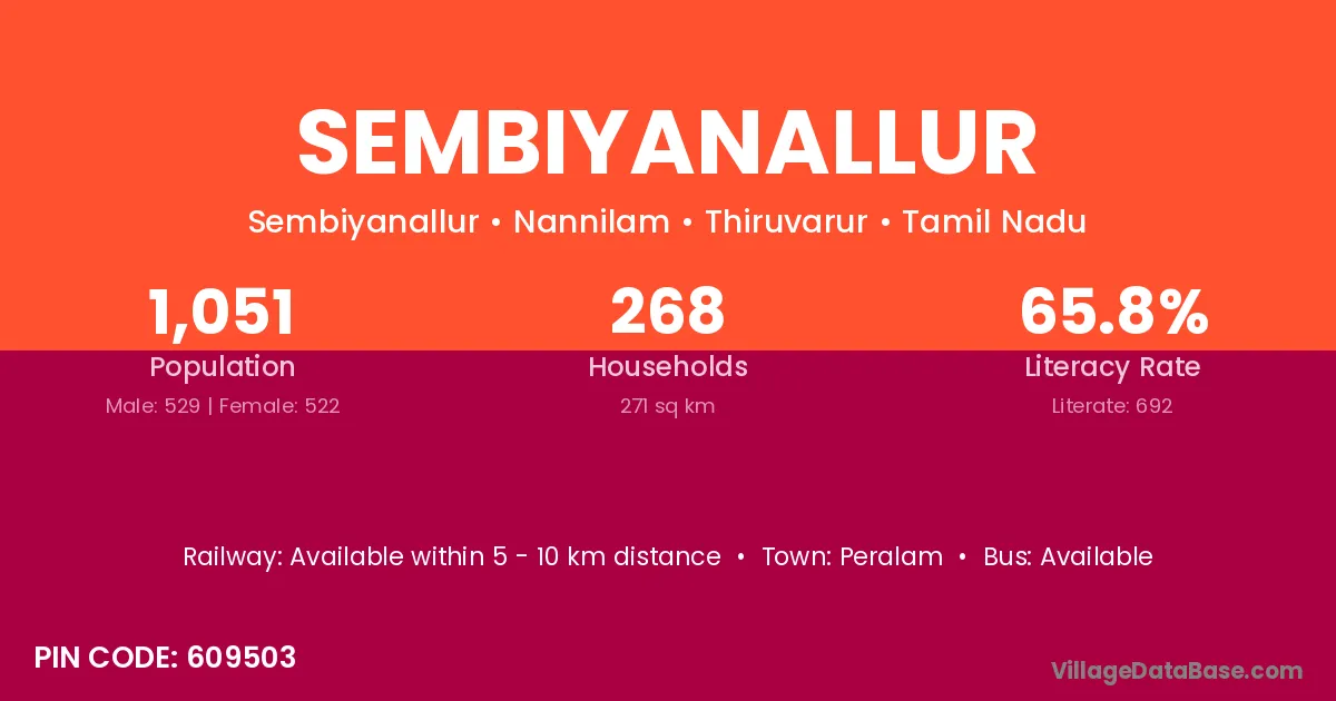 Sembiyanallur village has a total population of 1,051 people, of which 529 are males and 522 are females.