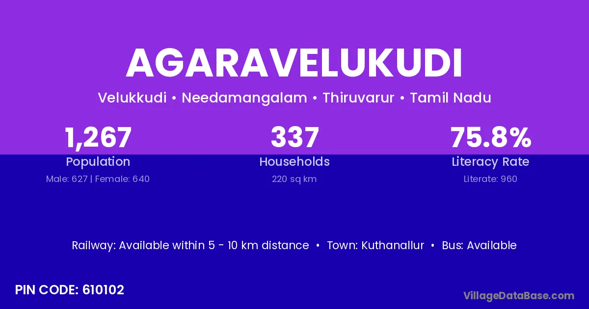 Agaravelukudi village has a total population of 1,267 people, of which 627 are males and 640 are females.
