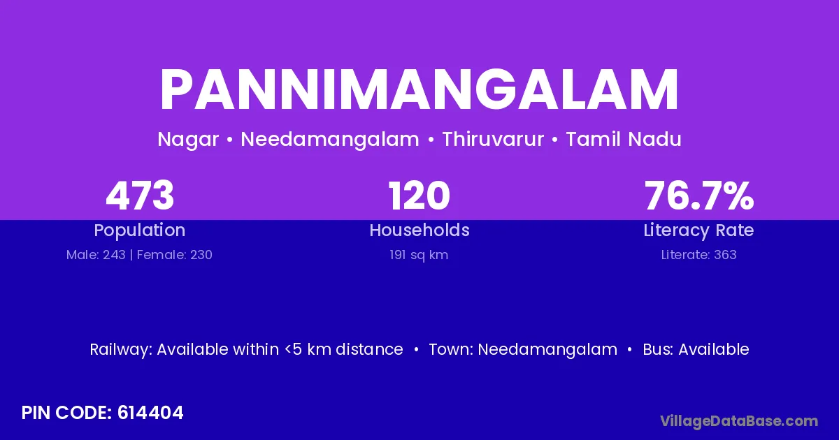 Pannimangalam village has a total population of 473 people, of which 243 are males and 230 are females.