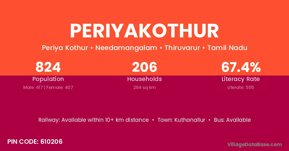Periyakothur village has a total population of 824 people, of which 417 are males and 407 are females.