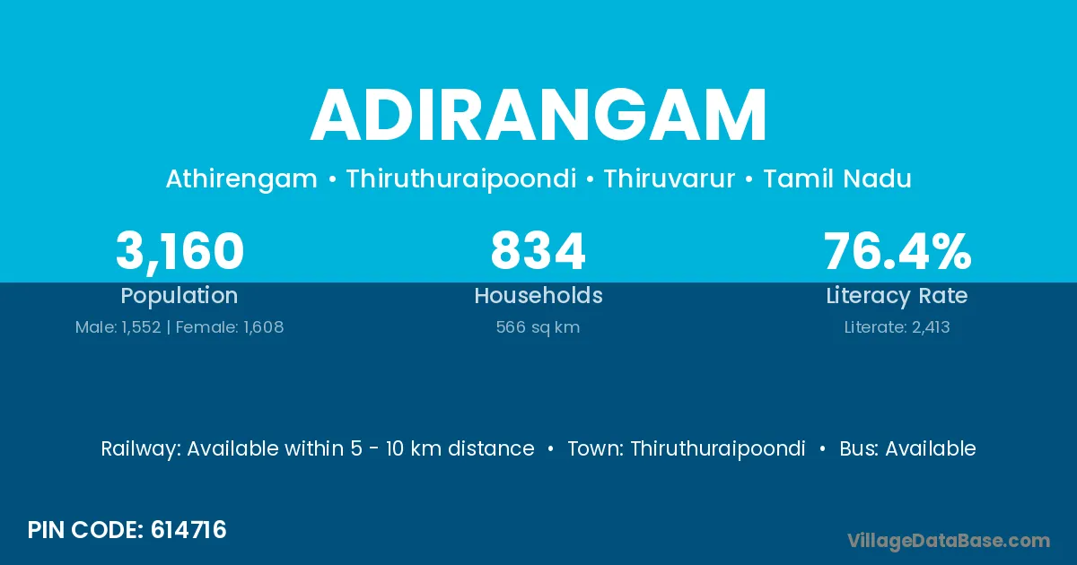Adirangam village has a total population of 3,160 people, of which 1,552 are males and 1,608 are females.