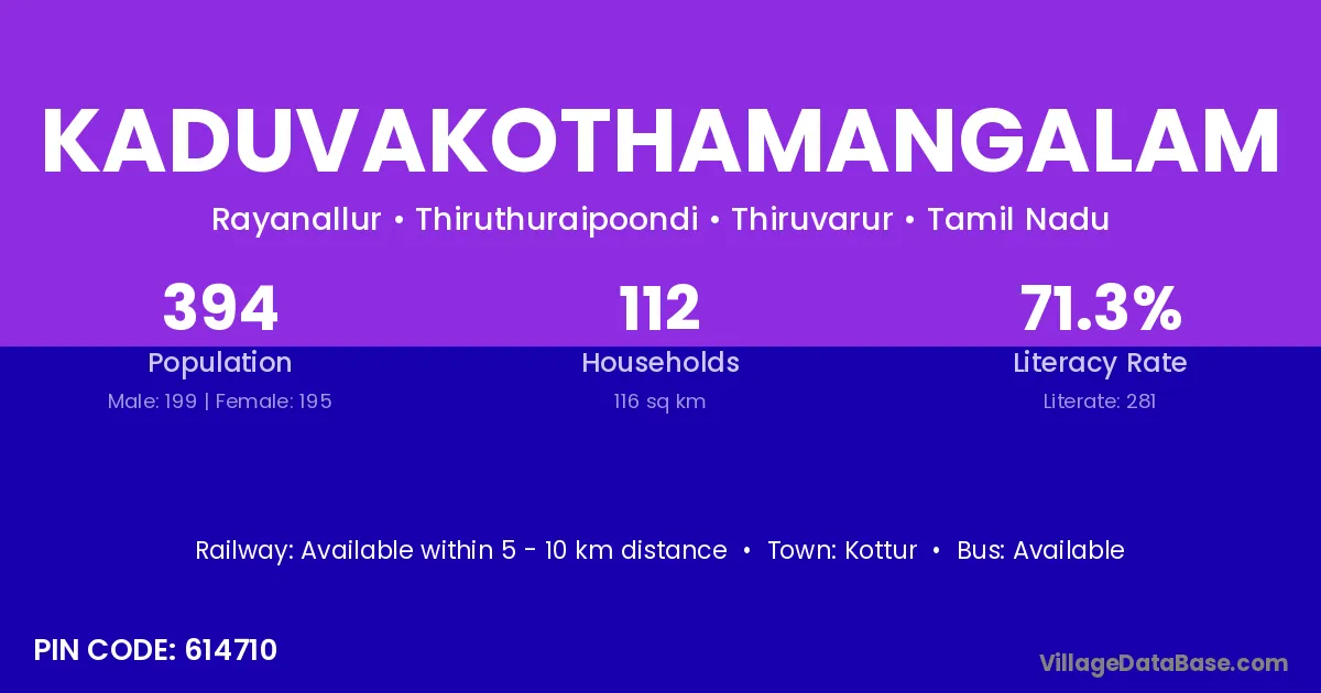 Kaduvakothamangalam village has a total population of 394 people, of which 199 are males and 195 are females.