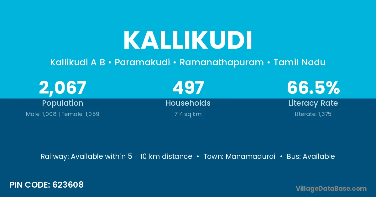 The literacy rate of Kallikudi village is 72.90%. Male literacy stands at 81.49% and female literacy at 64.47%.