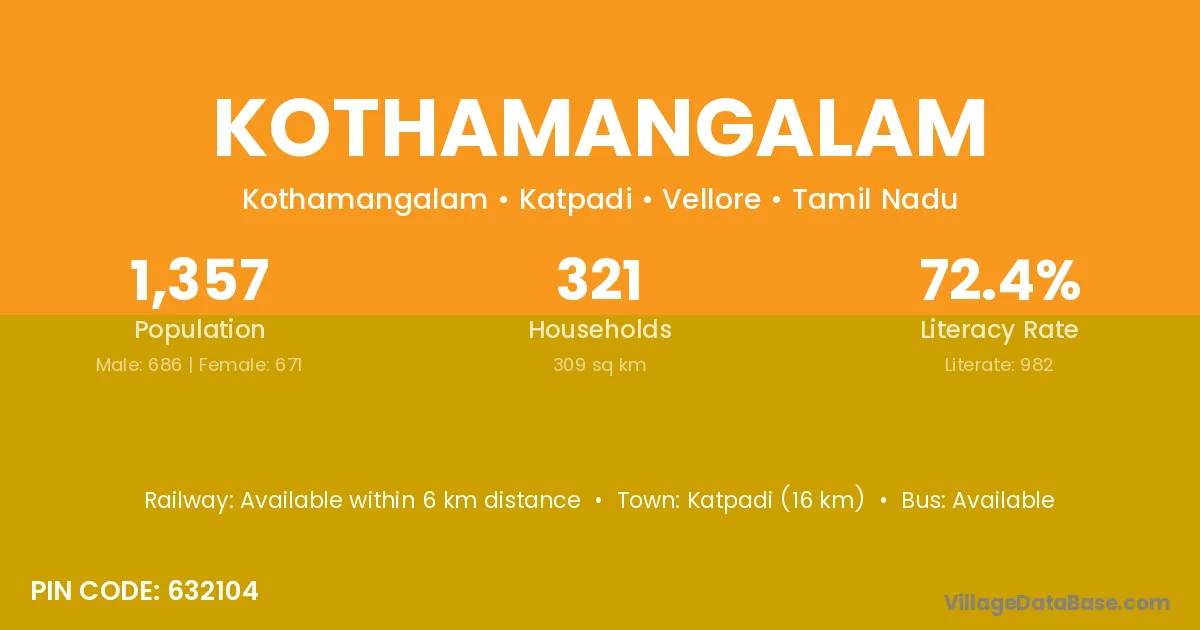 The literacy rate of Kothamangalam village is 72.69%. Male literacy stands at 79.15% and female literacy at 66.31%.