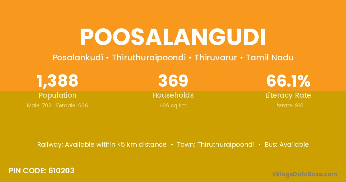 Poosalangudi village has a total population of 1,388 people, of which 702 are males and 686 are females.