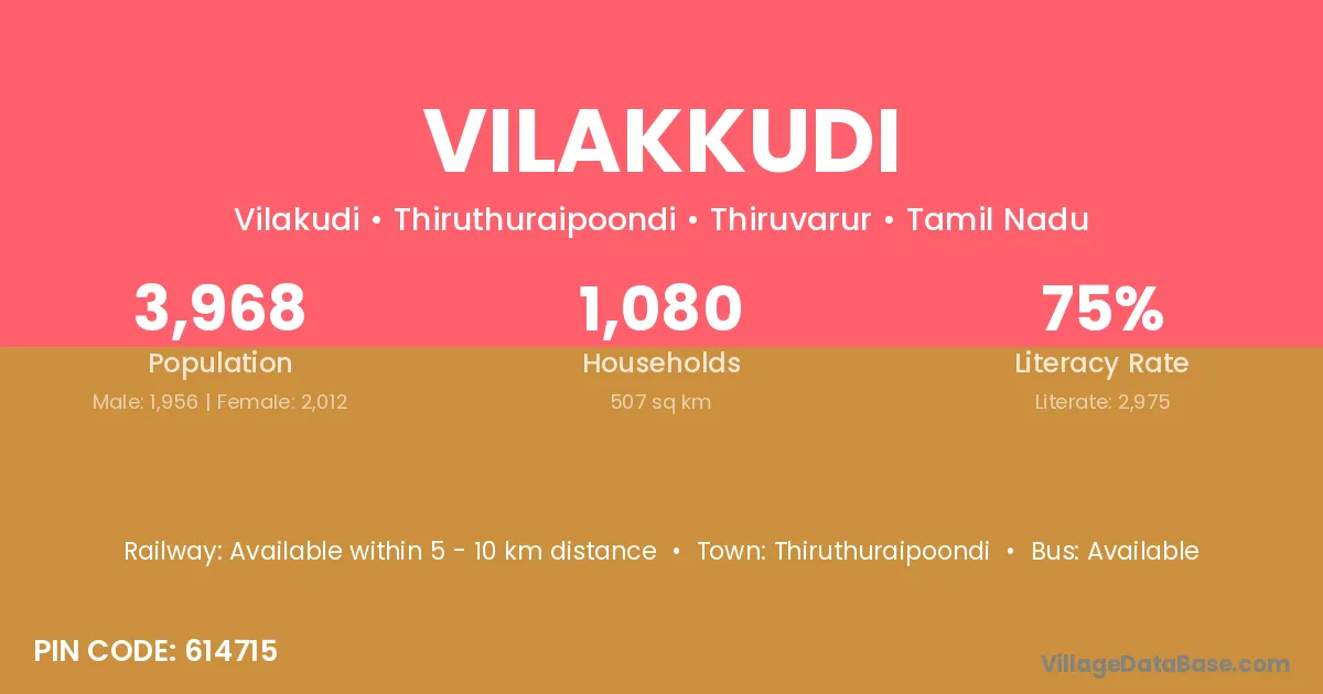 Vilakkudi village has a total population of 3,968 people, of which 1,956 are males and 2,012 are females.