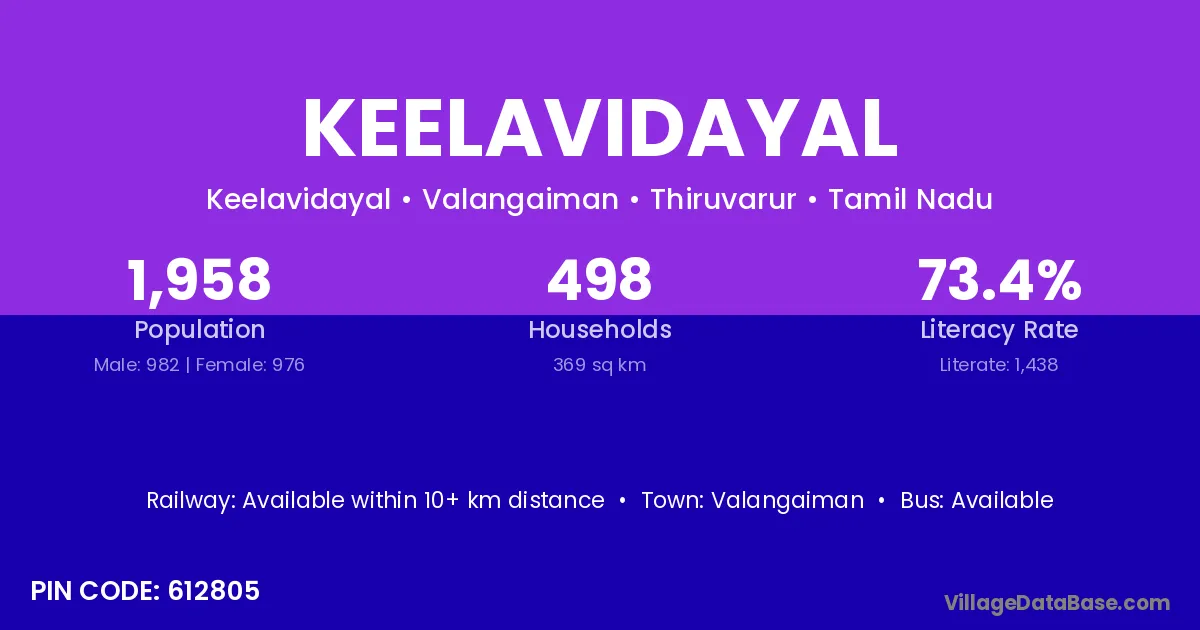 Keelavidayal village has a total population of 1,958 people, of which 982 are males and 976 are females.