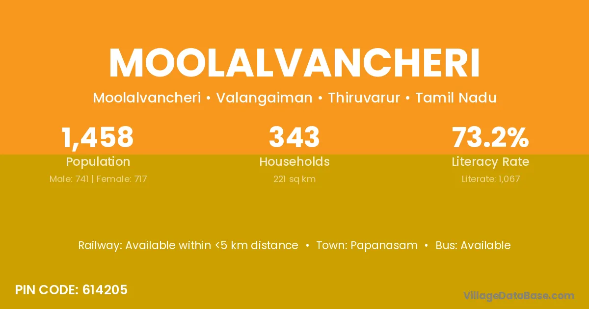 Moolalvancheri village has a total population of 1,458 people, of which 741 are males and 717 are females.