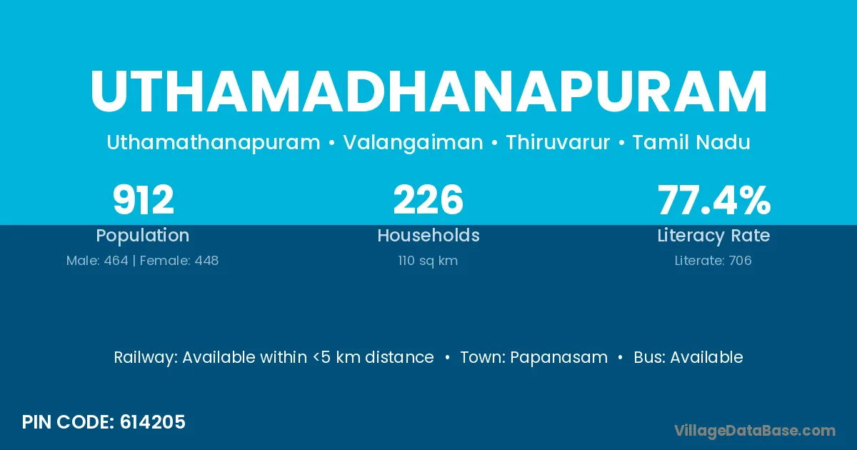 Uthamadhanapuram village has a total population of 912 people, of which 464 are males and 448 are females.