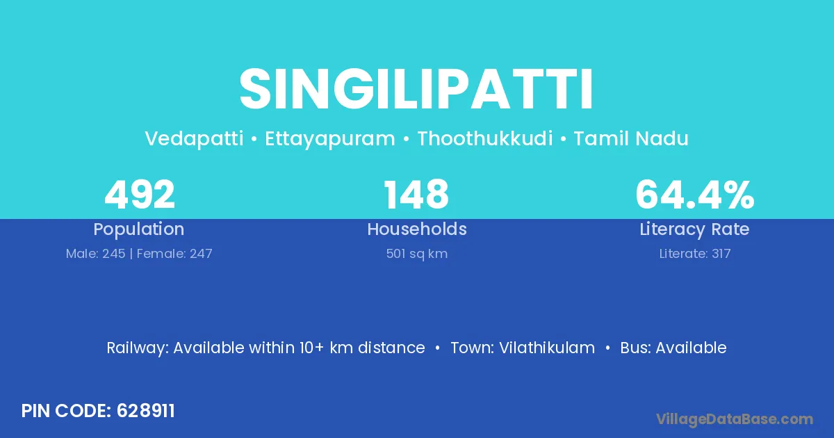 Singilipatti village has a total population of 492 people, of which 245 are males and 247 are females.