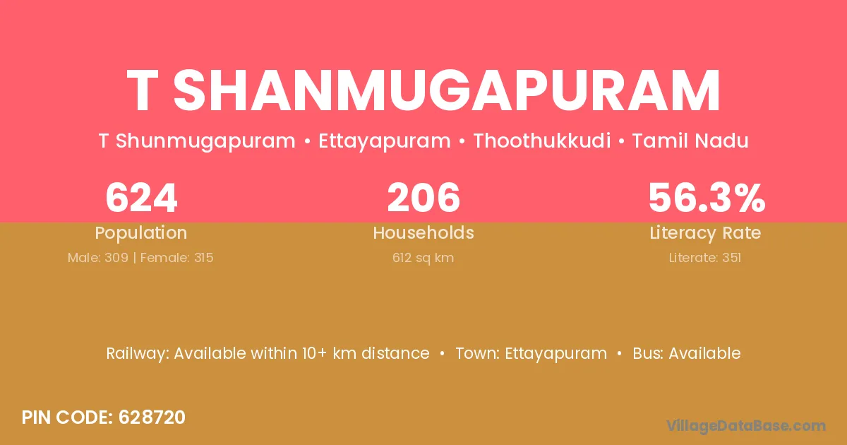T Shanmugapuram village has a total population of 624 people, of which 309 are males and 315 are females.