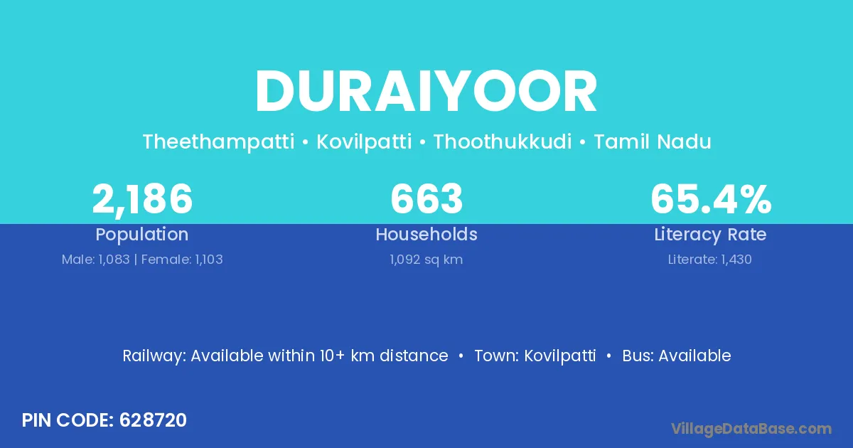 Kovilpatti is the nearest town to Duraiyoor village for major economic activities