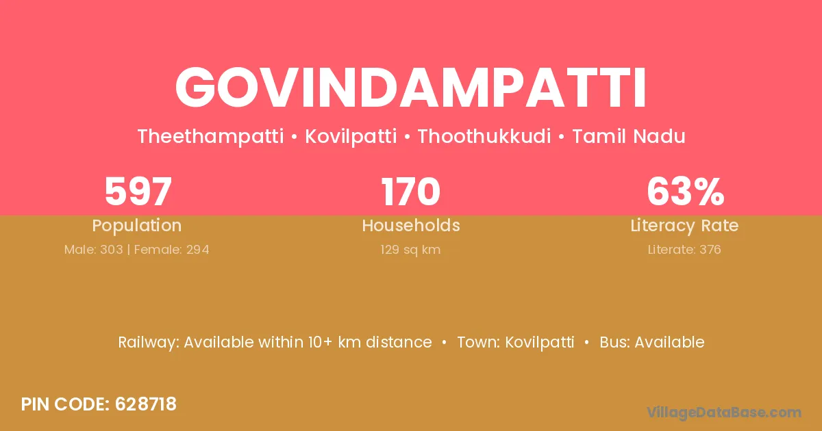 Govindampatti village has a total population of 597 people, of which 303 are males and 294 are females.