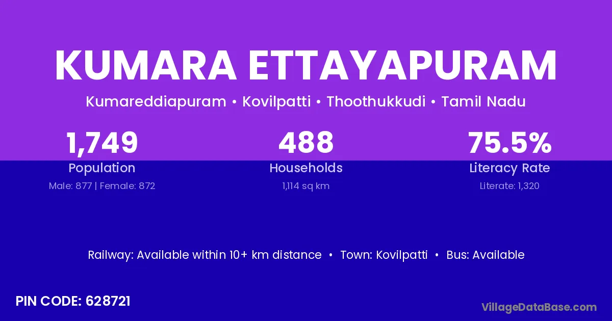 Kumara Ettayapuram village has a total population of 1,749 people, of which 877 are males and 872 are females.