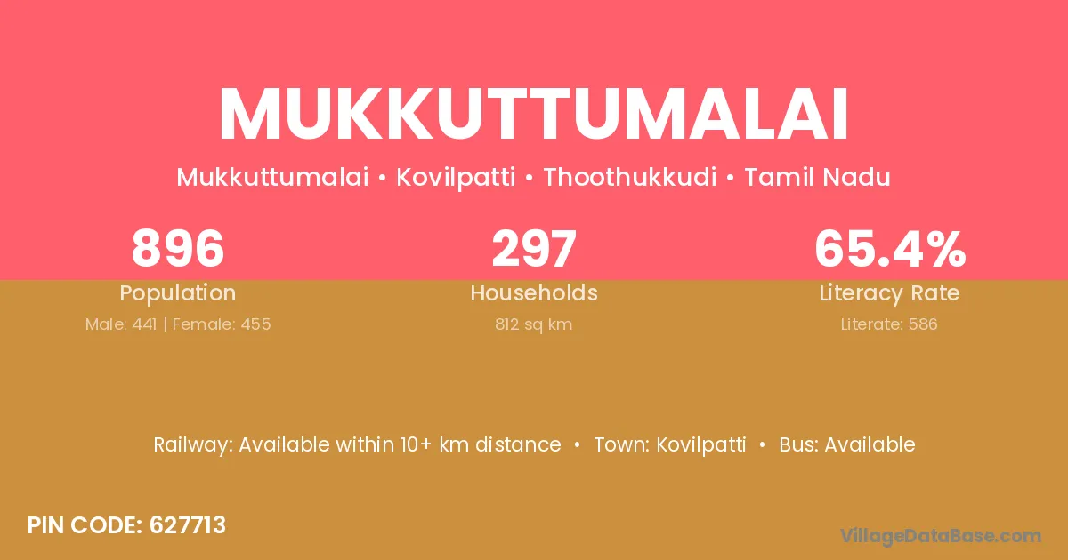 Mukkuttumalai village has a total population of 896 people, of which 441 are males and 455 are females.