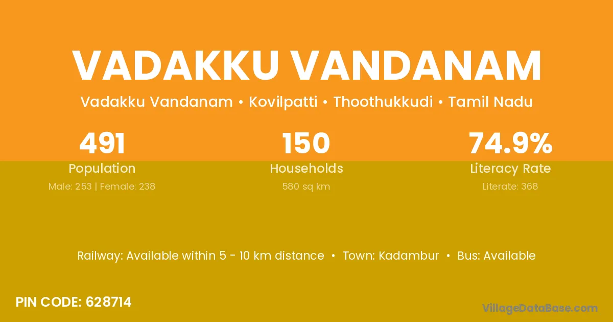 Vadakku Vandanam village has a total population of 491 people, of which 253 are males and 238 are females.