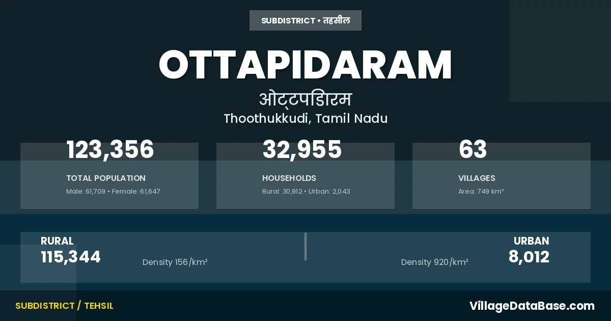According to the 2011 census The total area of Ottapidaram Taluka is 749 km², with a population of 123356 people. The population density is 165 inhabitants per square kilometre, and there are approximately 32955 houses in the sub district.