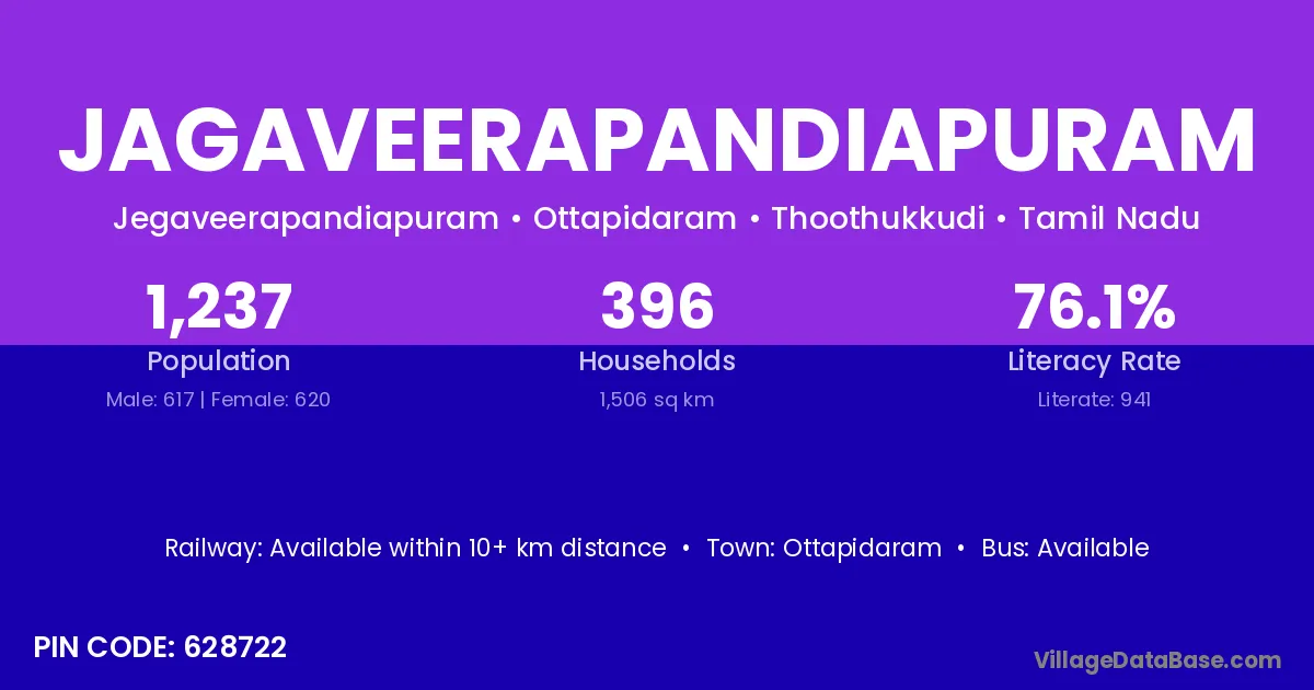 Jagaveerapandiapuram village has a total population of 1,237 people, of which 617 are males and 620 are females.