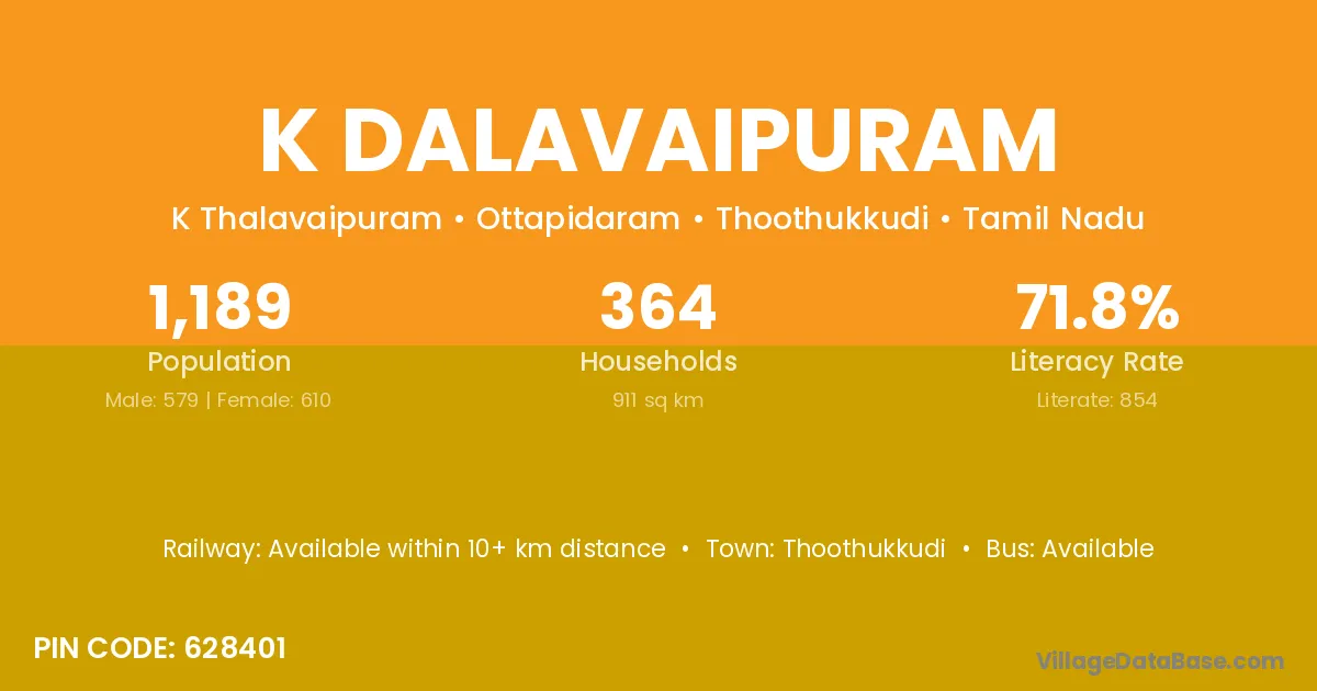 K Dalavaipuram village has a total population of 1,189 people, of which 579 are males and 610 are females.