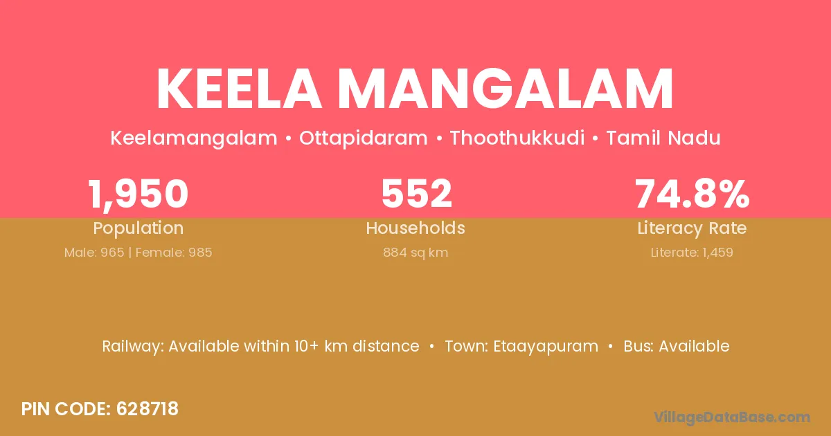 Keela Mangalam village has a total population of 1,950 people, of which 965 are males and 985 are females.