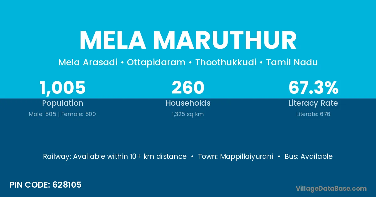 Mela Maruthur village has a total population of 1,005 people, of which 505 are males and 500 are females.