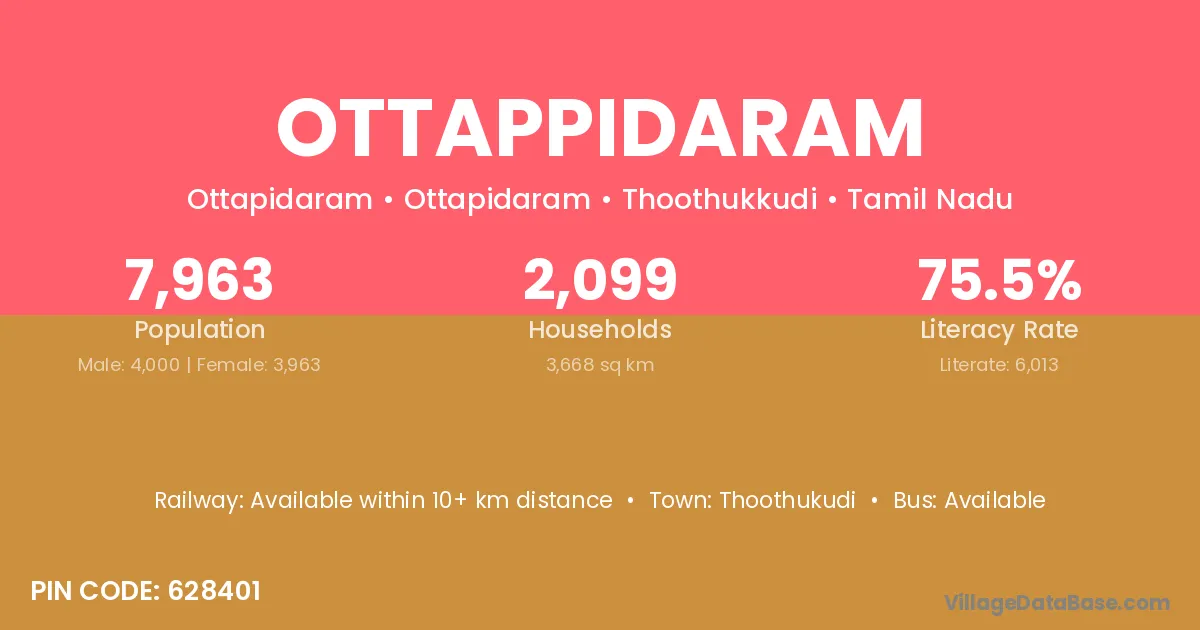 Ottappidaram village has a total population of 7,963 people, of which 4,000 are males and 3,963 are females.