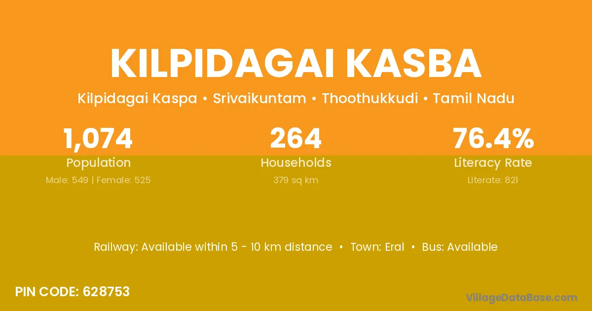 Kilpidagai Kasba village has a total population of 1,074 people, of which 549 are males and 525 are females.
