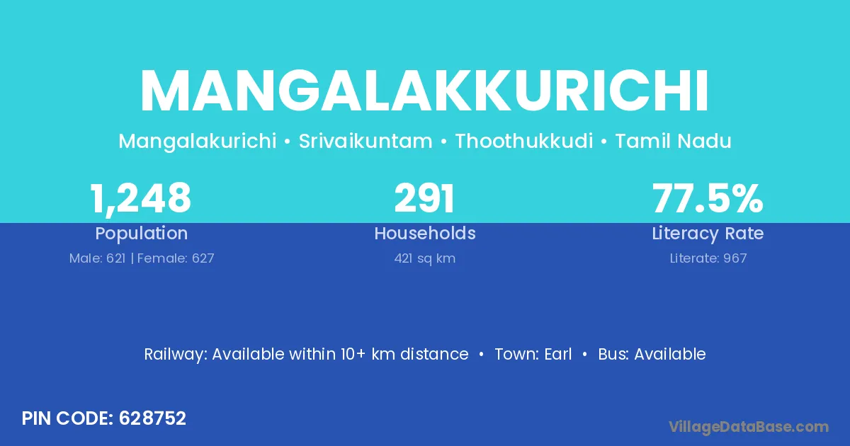 Mangalakkurichi village has a total population of 1,248 people, of which 621 are males and 627 are females.
