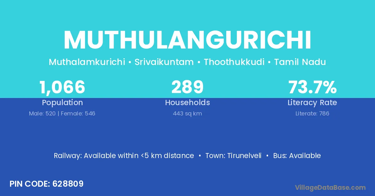 Muthulangurichi village has a total population of 1,066 people, of which 520 are males and 546 are females.