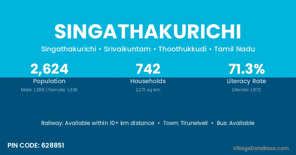 Singathakurichi village has a total population of 2,624 people, of which 1,288 are males and 1,336 are females.