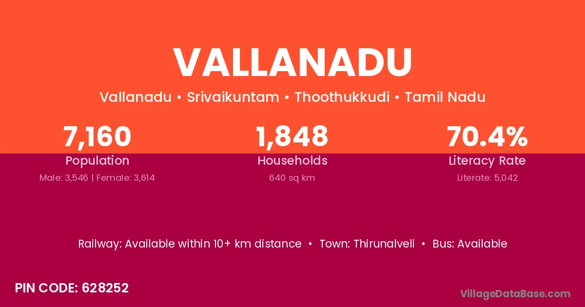 Vallanadu village has a total population of 7,160 people, of which 3,546 are males and 3,614 are females.