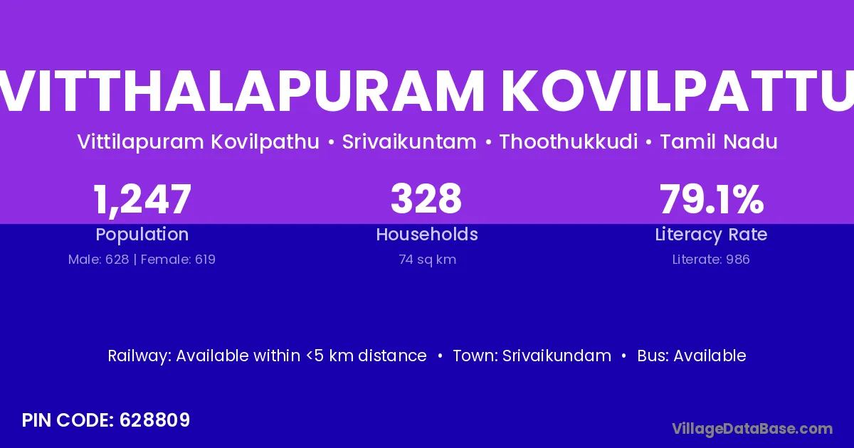 Vitthalapuram Kovilpattu village has a total population of 1,247 people, of which 628 are males and 619 are females.