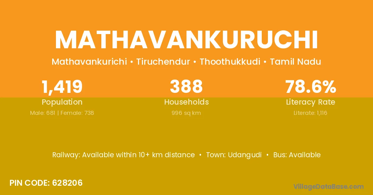 Mathavankuruchi village has a total population of 1,419 people, of which 681 are males and 738 are females.