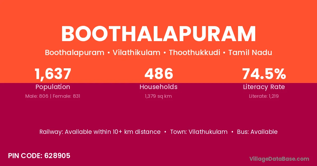 Boothalapuram village has a total population of 1,637 people, of which 806 are males and 831 are females.