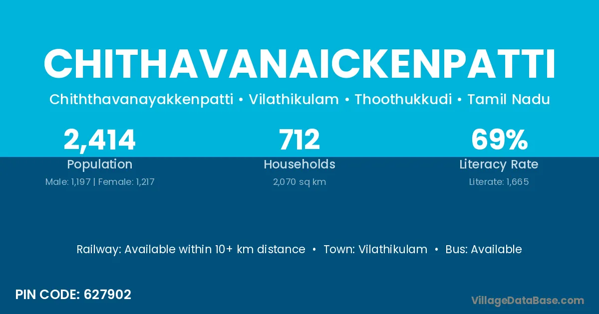 Chithavanaickenpatti village has a total population of 2,414 people, of which 1,197 are males and 1,217 are females.