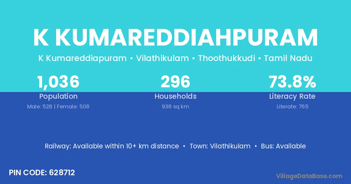 K Kumareddiahpuram village has a total population of 1,036 people, of which 528 are males and 508 are females.