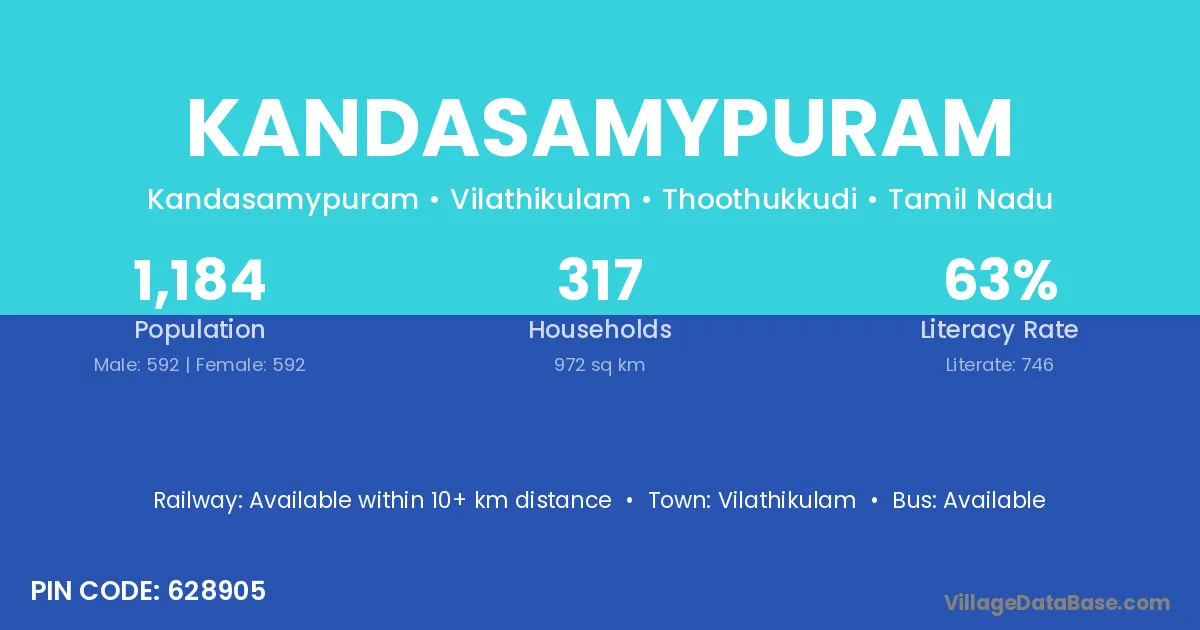 Kandasamypuram village has a total population of 1,184 people, of which 592 are males and 592 are females.