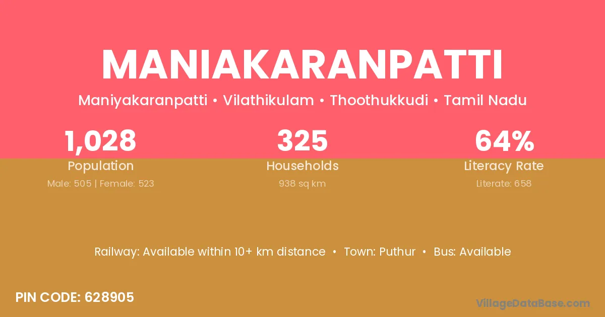 Maniakaranpatti village has a total population of 1,028 people, of which 505 are males and 523 are females.