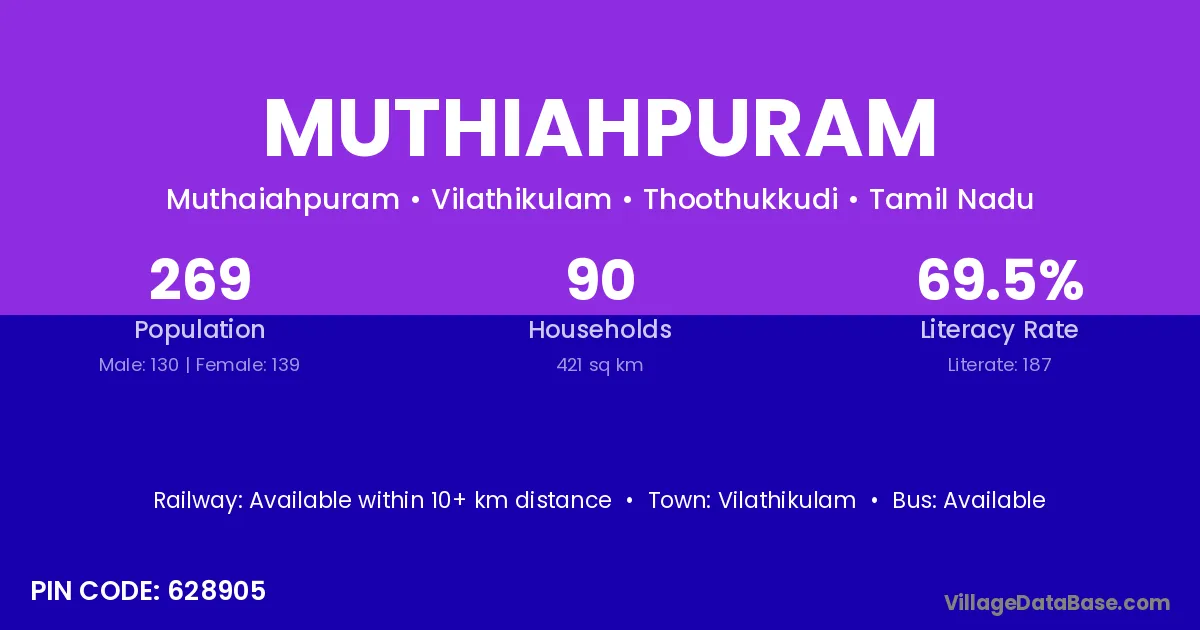 Muthiahpuram village has a total population of 269 people, of which 130 are males and 139 are females.