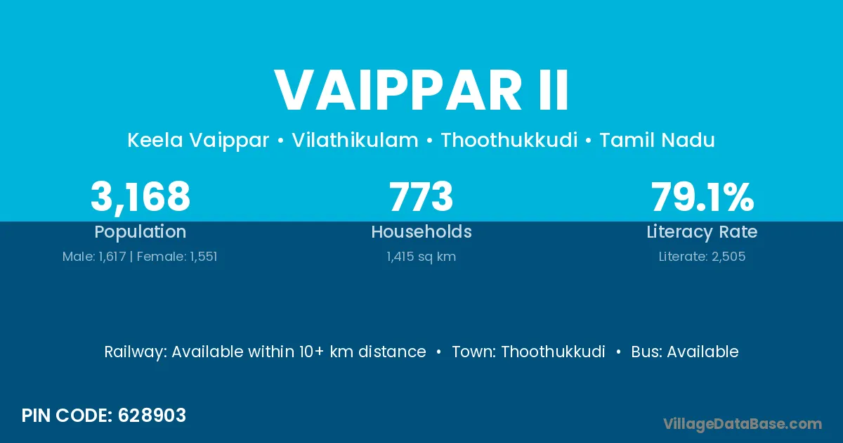 Vaippar Ii village has a total population of 3,168 people, of which 1,617 are males and 1,551 are females.