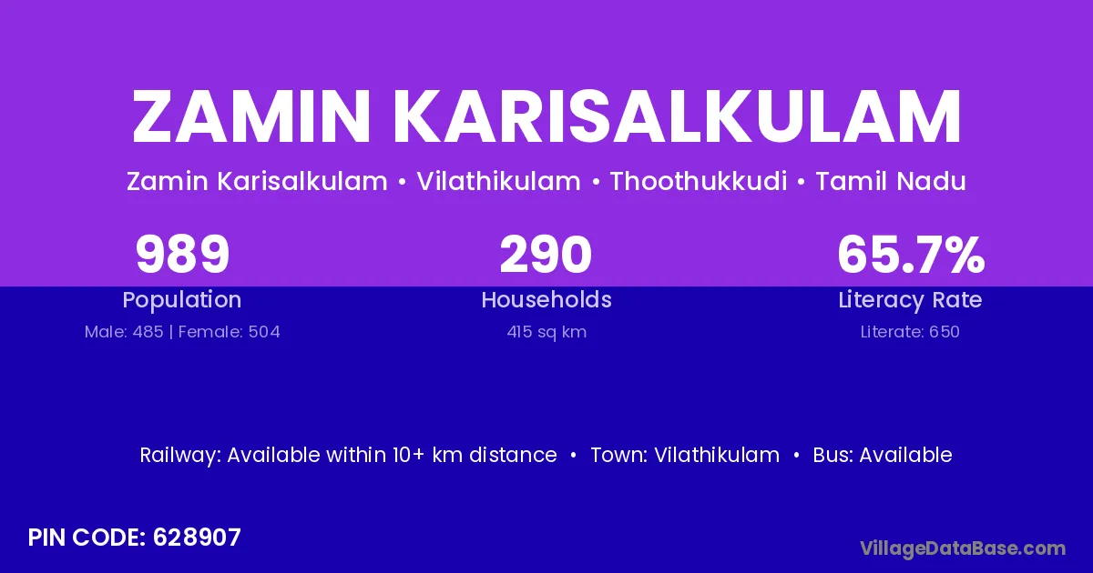 Zamin Karisalkulam village has a total population of 989 people, of which 485 are males and 504 are females.