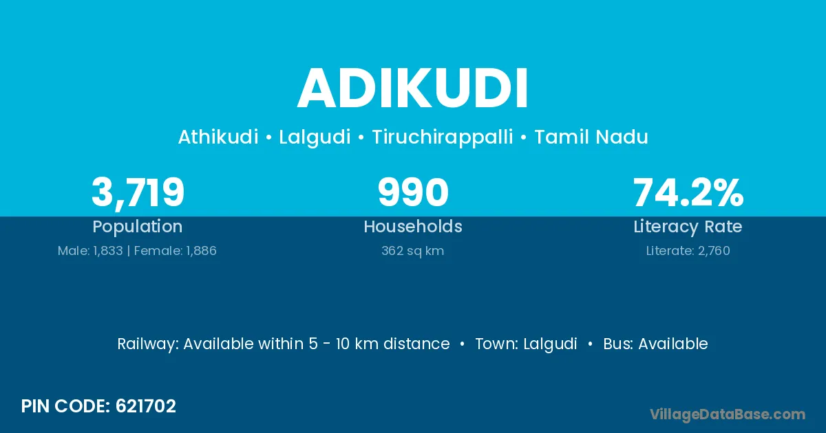 Lalgudi is the nearest town to Adikudi village for major economic activities