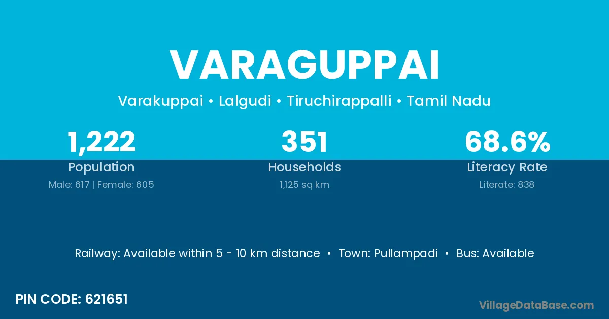 Varaguppai village has a total population of 1,222 people, of which 617 are males and 605 are females.