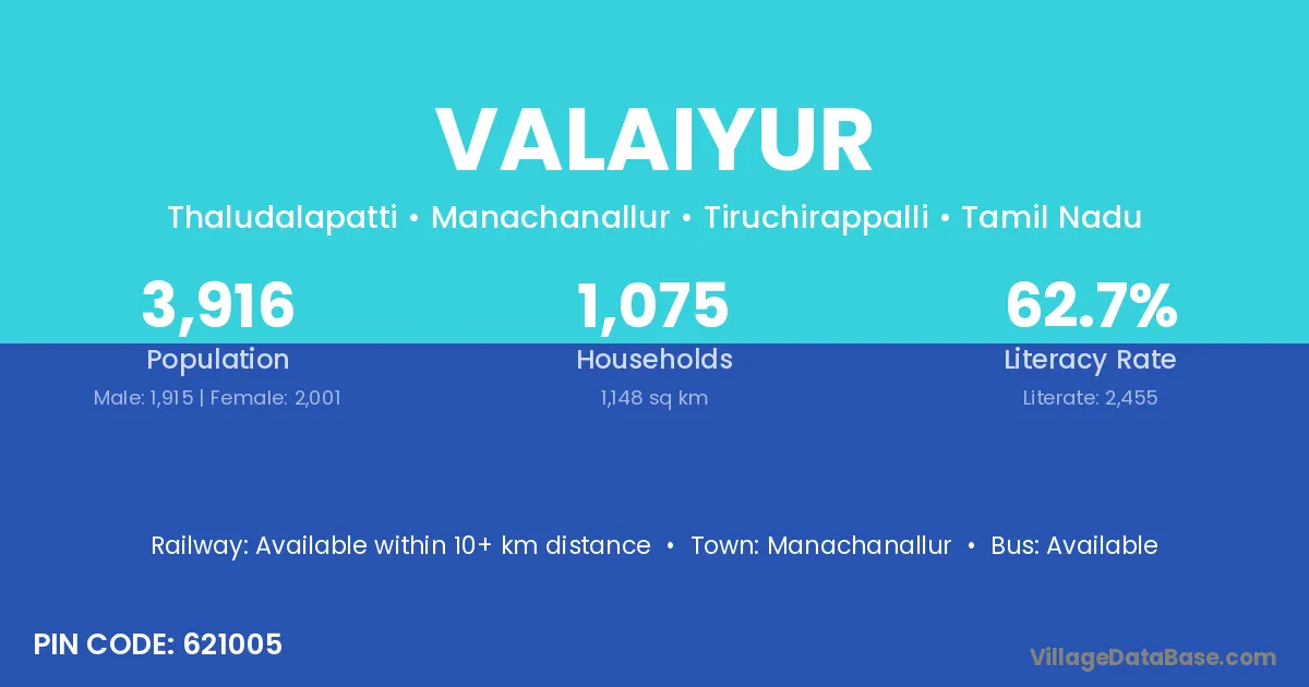 Manachanallur is the nearest town to Valaiyur village for major economic activities