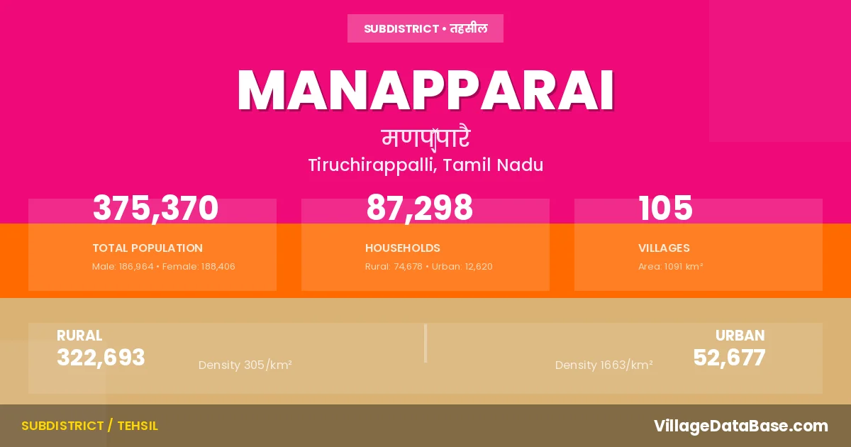 According to the 2011 census The total area of Manapparai Taluka is 1091 km², with a population of 375370 people. The population density is 344 inhabitants per square kilometre, and there are approximately 87298 houses in the sub district.