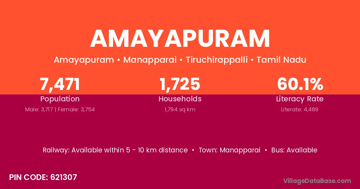 Amayapuram village has a total population of 7,471 people, of which 3,717 are males and 3,754 are females.